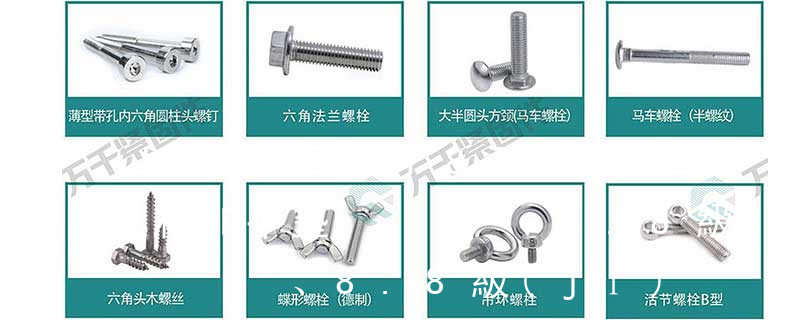 11. 組合件和連接副:組合件是指組合供應(yīng)的一類緊固件,如將某種機(jī)器螺釘(或螺栓、自供螺釘)與平墊圈(或彈簧墊圈、鎖緊墊圈)組合供應(yīng);連接副指將某種專用螺栓、螺母和墊圈組合供應(yīng)的一類緊固件,如鋼結(jié)構(gòu)用高強(qiáng)度大六角頭螺栓連接副。 1、螺栓+螺帽+平墊+彈墊 2、螺栓+螺帽+臺(tái)階墊片+圓柱形橡膠 3、螺栓+螺帽+倒角墊片+O型橡膠墊圈 4、螺栓+螺帽+碗墊+橡膠圈或麻繩墊 螺母、螺栓有8.8級(jí),4.8級(jí)別 A3 Q235,Q195等低碳 鋼 5.8級(jí)別 Q235以上所有